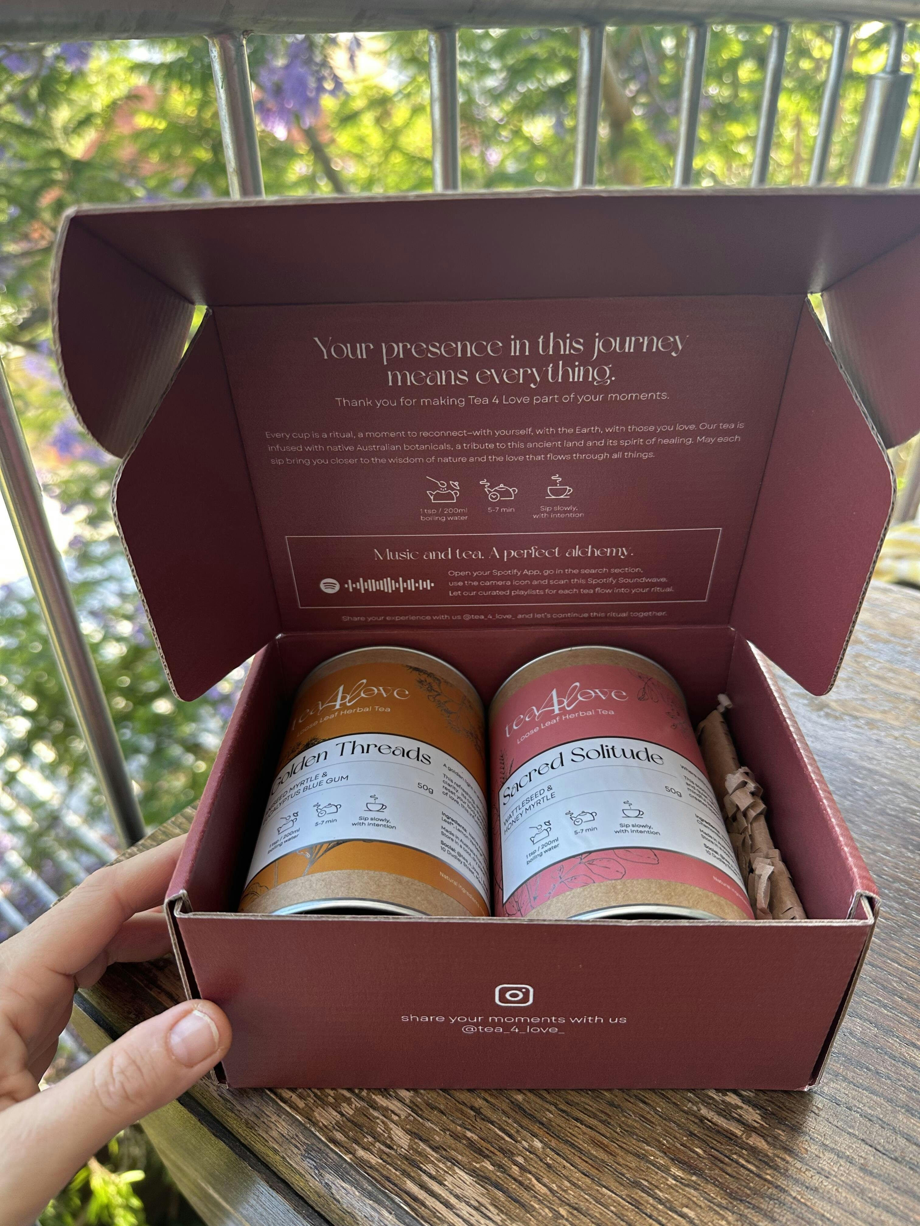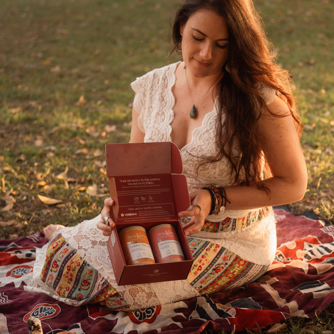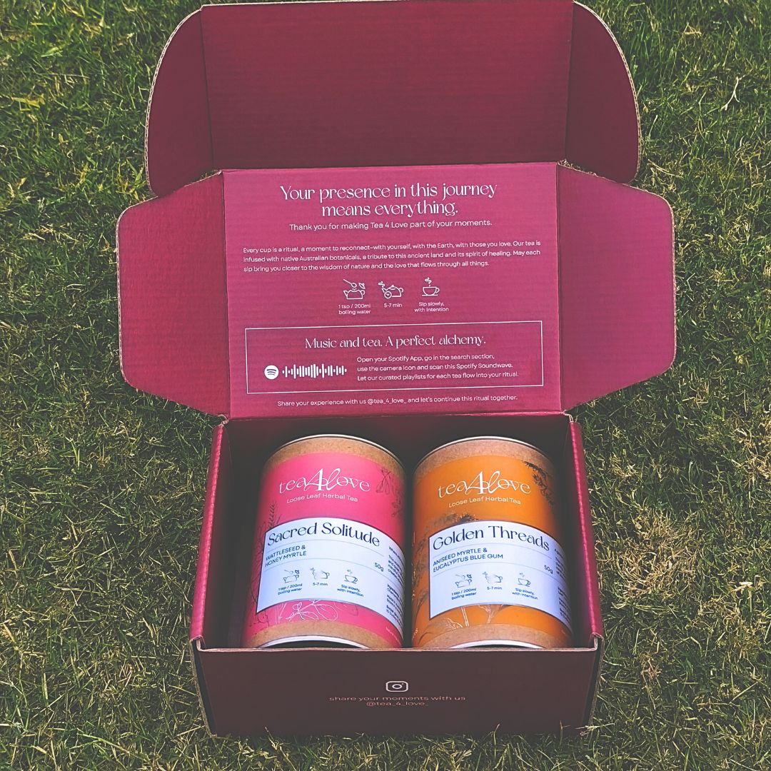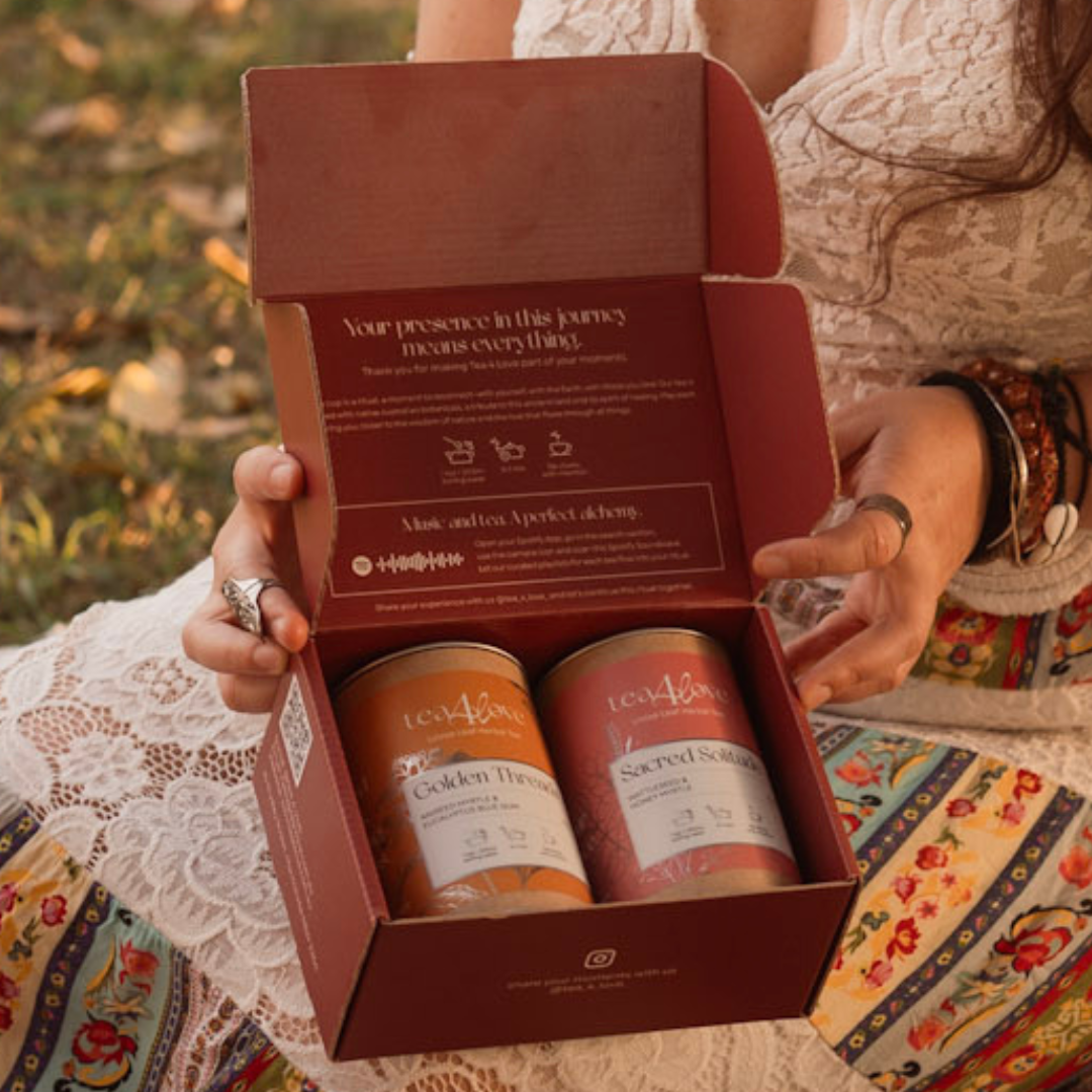 The Self Love Duo is a gentle companion for inner reflection. Begin your ritual with Golden Threads, a refreshing infusion that clears the mind and opens space for creativity and light. Then embrace Sacred Solitude, a grounding blend that soothes the body, calms the spirit, and deepens the connection to your inner world. Together, they transform simple pauses into sacred self-care rituals - moments of presence, journaling, and meditation that nurture your emotional balance.